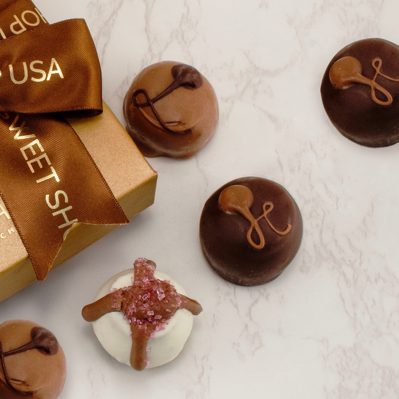- Sweet Shop 5-piece handmade chocolate assortment in a golden gift box